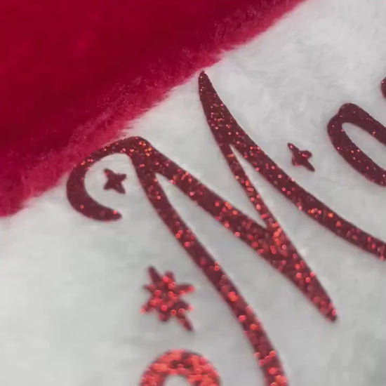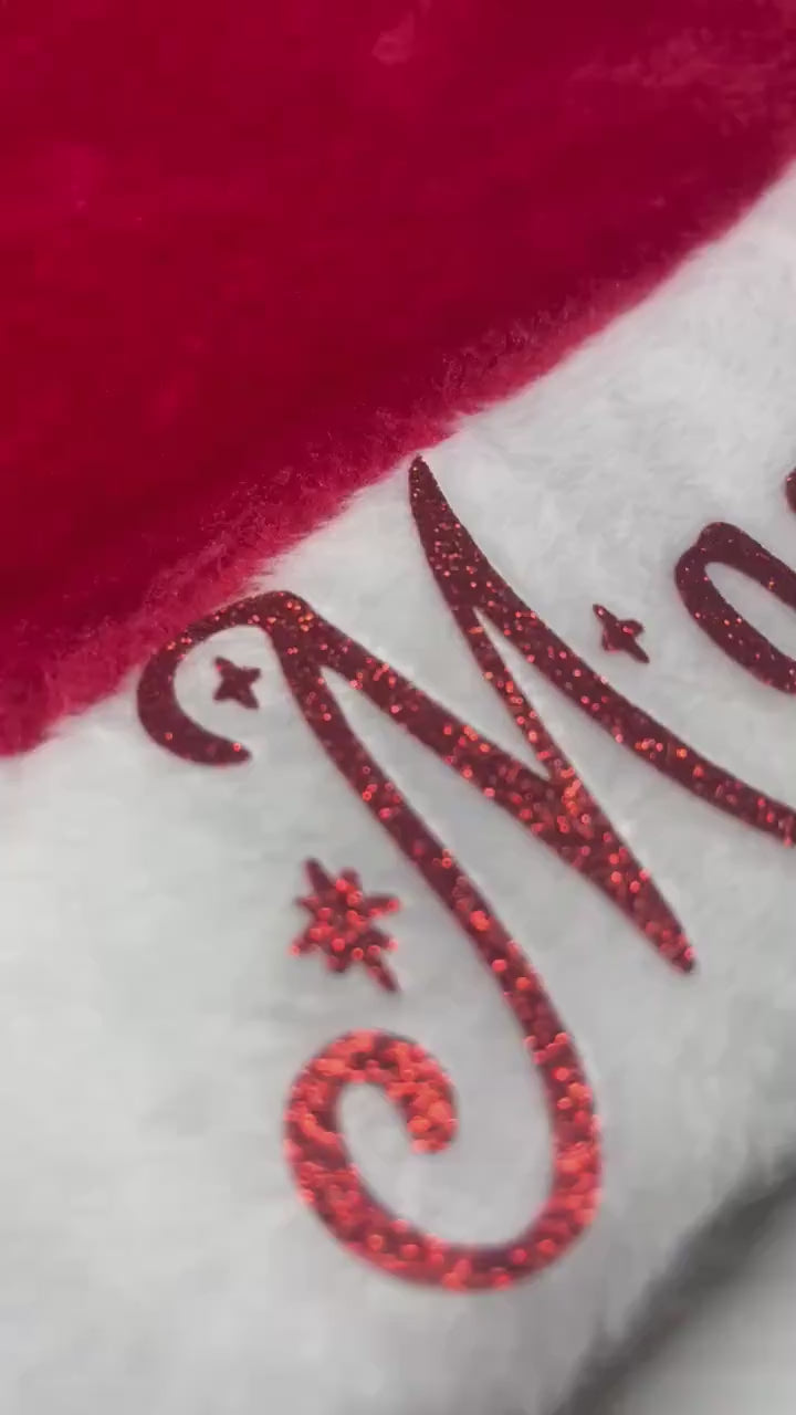 Personalized plush Santa Hat for your parades, parties and just to be festive, family party . I use a high quality heat transfer mate or glittery vinyl and use a professional grade press to adhere the vinyl to the stocking. I have several different colors of vinyl to choose from.